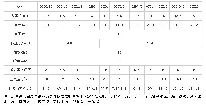 五,QXB離心式潛水曝氣機(jī)性能參數(shù)